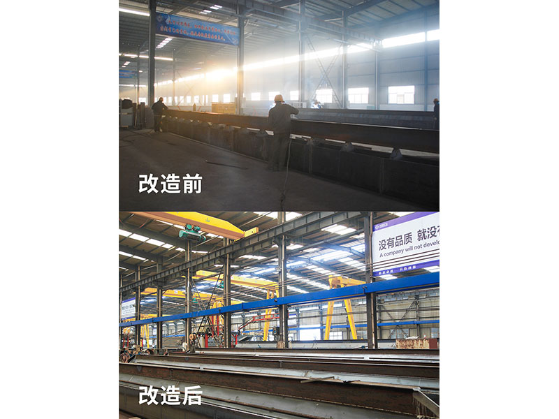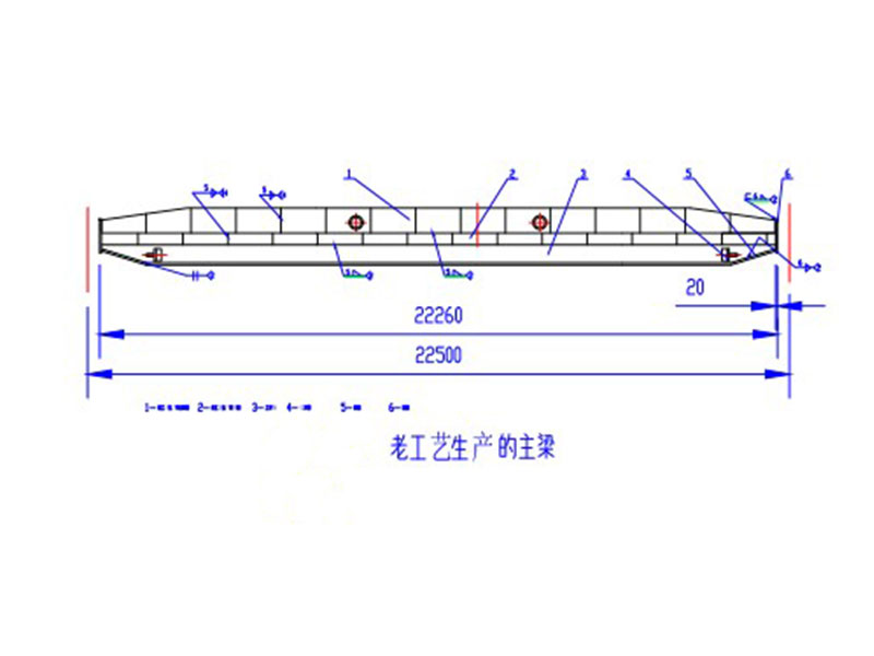 電動單梁起重機(jī)主梁原來主要采用U型槽加筋板焊接工字鋼,然后焊接兩側(cè)板再聯(lián)接端梁的方式制作。該工藝缺點(diǎn)是U型槽生產(chǎn)效率低、勞動強(qiáng)度大、焊接費(fèi)用高、焊接工序耗時較長,焊接變形量大,焊接過程產(chǎn)生較多電焊煙塵,污染嚴(yán)重,在進(jìn)行多段拼板、焊接、整形的過程中,焊接質(zhì)量難保證,時有主梁橫向焊縫產(chǎn)生裂紋缺痕。